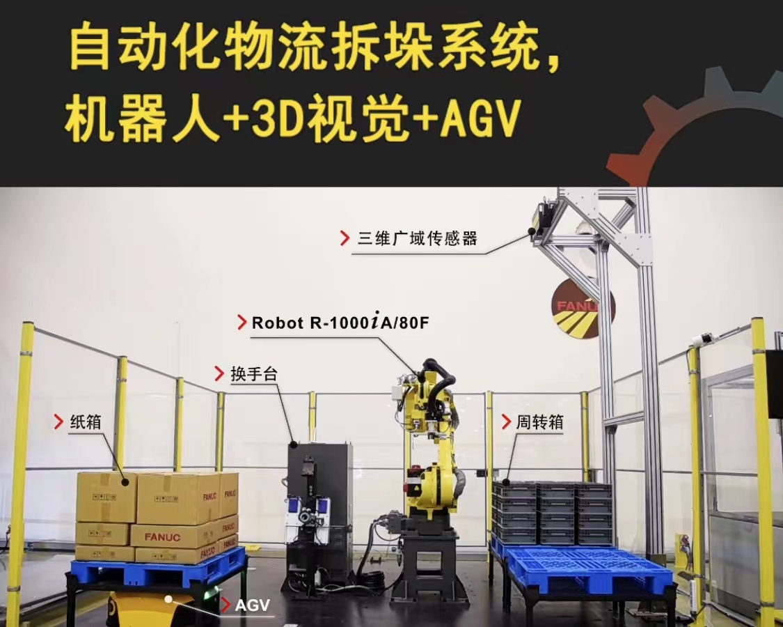 纸箱及周转箱是当今的工厂中必不可少的物流载体,关于它们的拆垛应用,有不少难题:垛形复杂多变、箱体种类繁多等。为解决上述难题,上海发那科开发了智能机器人自动化物流拆垛系统,为一种:机器人+3D视觉+AGV的解决方案。